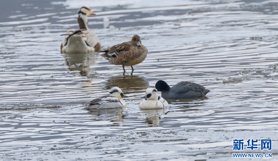 兩只斑頭秋沙鴨雄鳥與其他鳥類同框(1月27日攝)。新華網發(朱邊勇 攝)