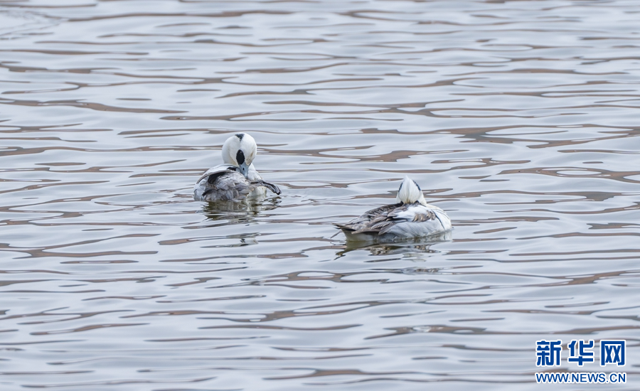 兩只斑頭秋沙鴨在水中梳理羽毛(1月27日攝)。新華網發(朱邊勇 攝)