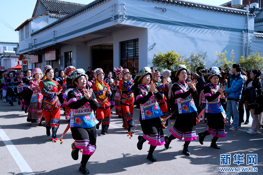2日,云南省文山壯族苗族自治州硯山縣平遠鎮田心社區民族團結幸福路開街儀式舉行,各族群眾穿起民族服裝、跳起民族舞蹈,吸引游客前來趕集游玩。