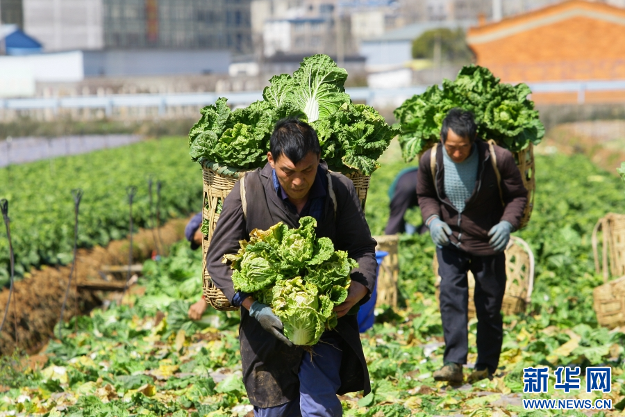 2月5日,在云南省曲靖市沾益區西平街道的一處蔬菜種植基地,菜農正在搬運采收好的白菜。