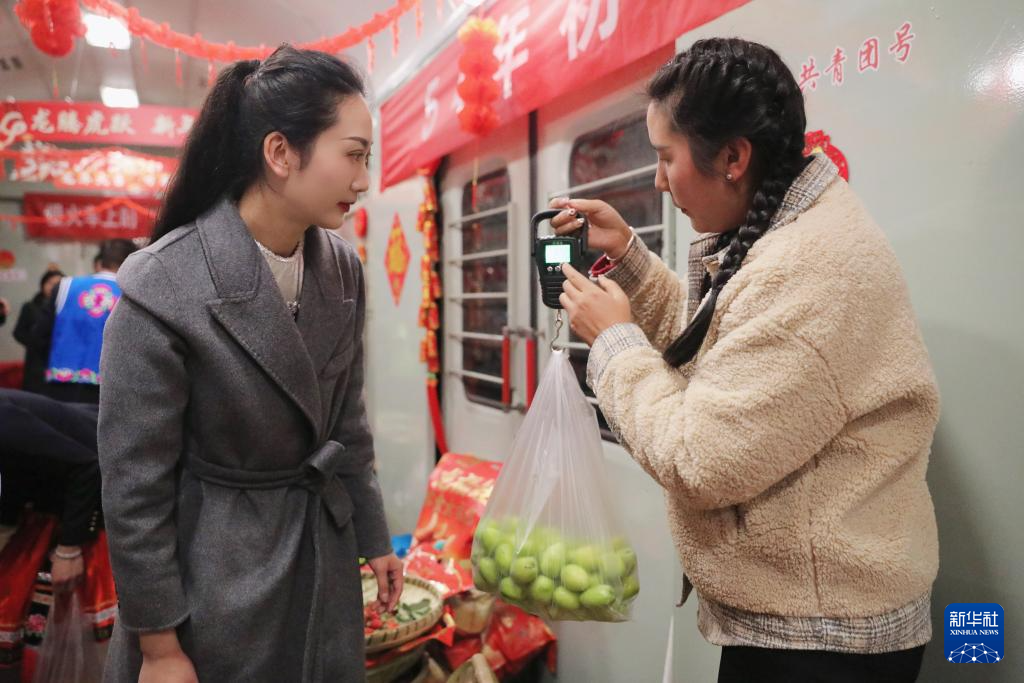 春節臨近,家家戶戶忙著采買年貨。中國鐵路昆明局集團有限公司在云南昆明至元謀西的公益性“慢火車”7466/5次列車上辦起了年貨街。