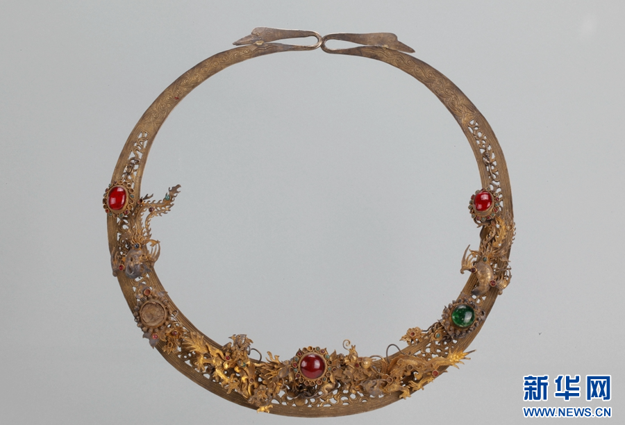(近代)傣族鏤雕龍鳳鑲石鍍金銀項圈