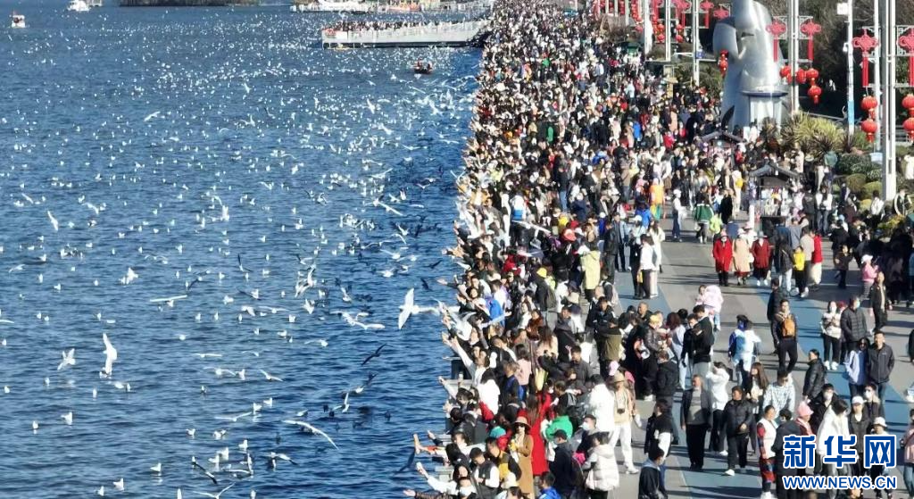 春節假期,市民、游客在昆明滇池海埂大壩喂紅嘴鷗。(張繼洪 攝)