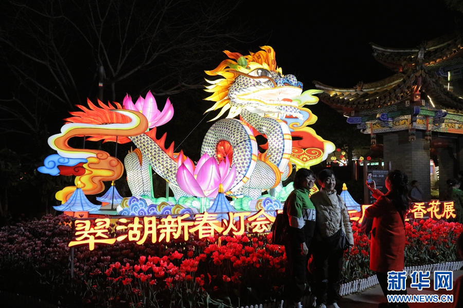 2月21日晚,游客在翠湖的一處花燈前留影。新華網發 (丁凝 攝)