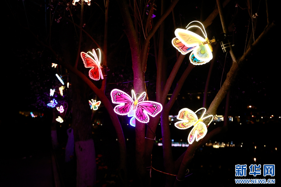 翠湖公園里,一條燈光長廊上裝飾的蝶形氛圍燈(攝于2月21日)。新華網發 (丁凝 攝)