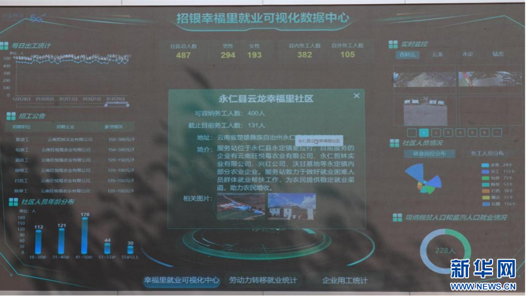在永仁縣蓮池鄉查利么村“幸福里”社區的就業可視化數據中心大屏上,直觀顯示出每日出工統計情況、企業招工公告、吸納脫貧人口和監測人口就業情況等信息。