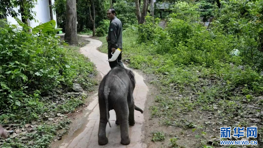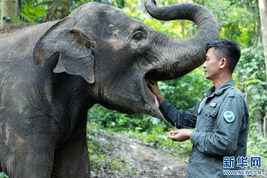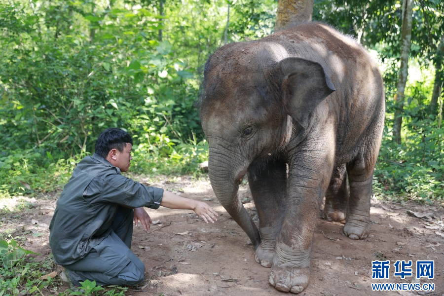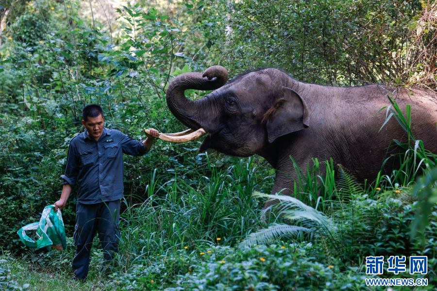 “象爸爸”鄔紹能陪伴“小強”進行野化訓練(2023年11月5日攝)。新華網發(劉云 攝)