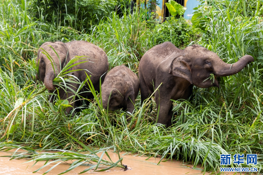 “平平”(左一)“然然”(右一)陪伴著“景景”在河道旁取食(2023年7月15日攝)。新華網發(劉云 攝)