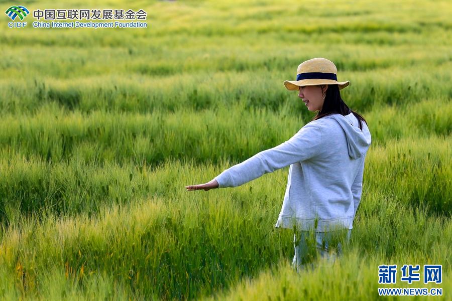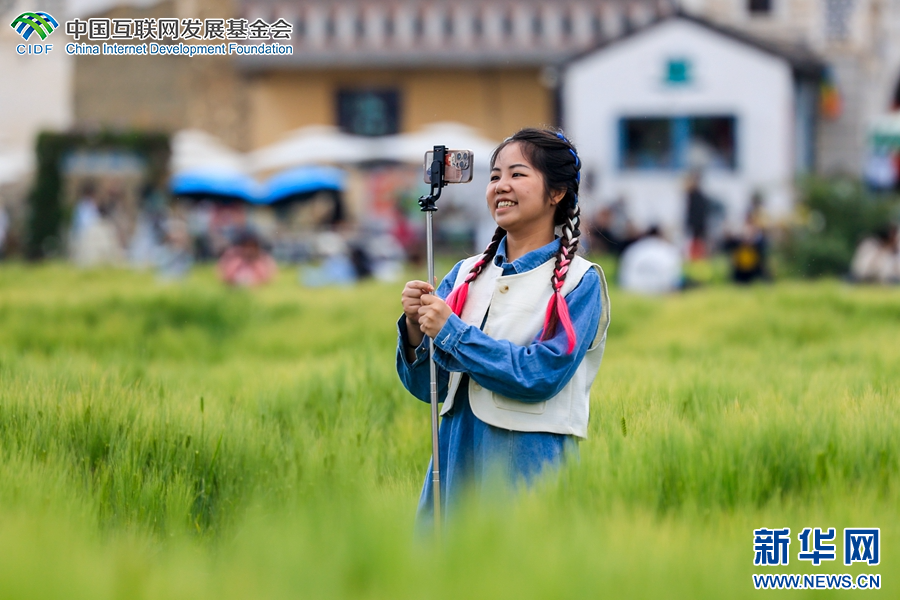 大理喜洲,一名游客在麥田里拍照(攝于4月1日)。新華網 趙普凡 攝