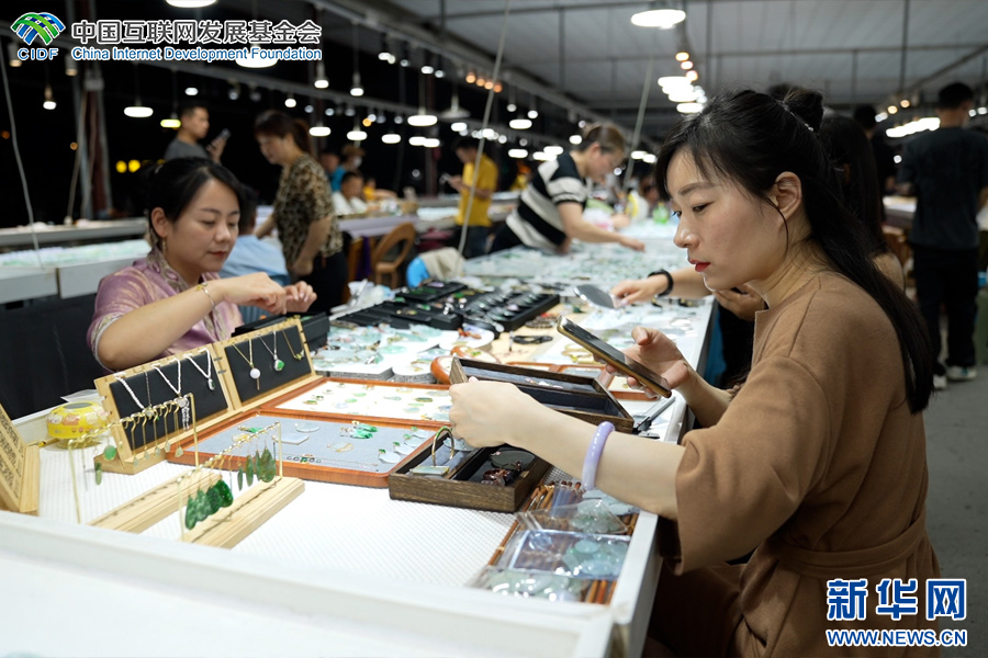 晚上9時許,走進夜市,便看到琳瑯滿目的珠寶玉石整齊地排列在貨架上,店主熱情地向顧客介紹著產品。在直播基地,主播們個個鉚足勁,為五湖四海的網友推介產品,掀起一波又一波的聲浪,場面熱鬧非凡——這般熱鬧會持續整晚,第二天便有大量珠寶玉石產品從瑞麗這座邊境小城,飛向四面八方,成為人們愛不釋手的“寶貝”。