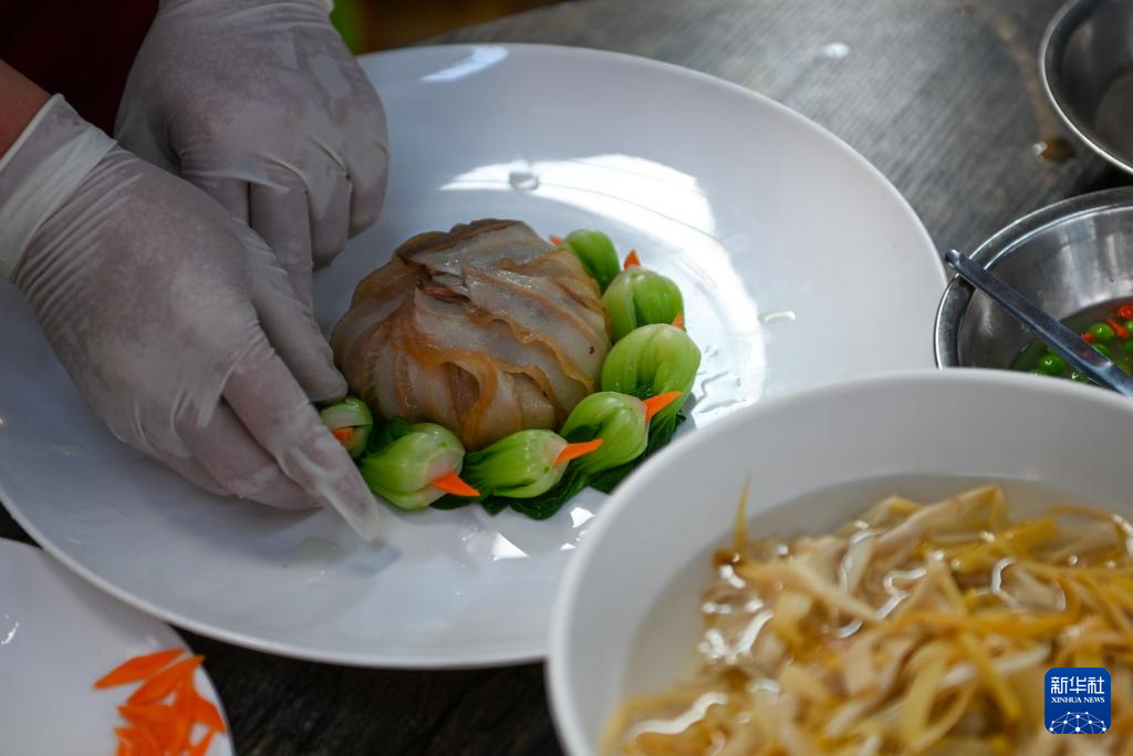 昆明一家餐廳的廚師在制作以芭蕉花為原料的菜肴。新華社記者曹夢瑤 攝