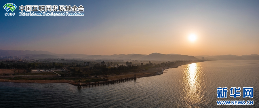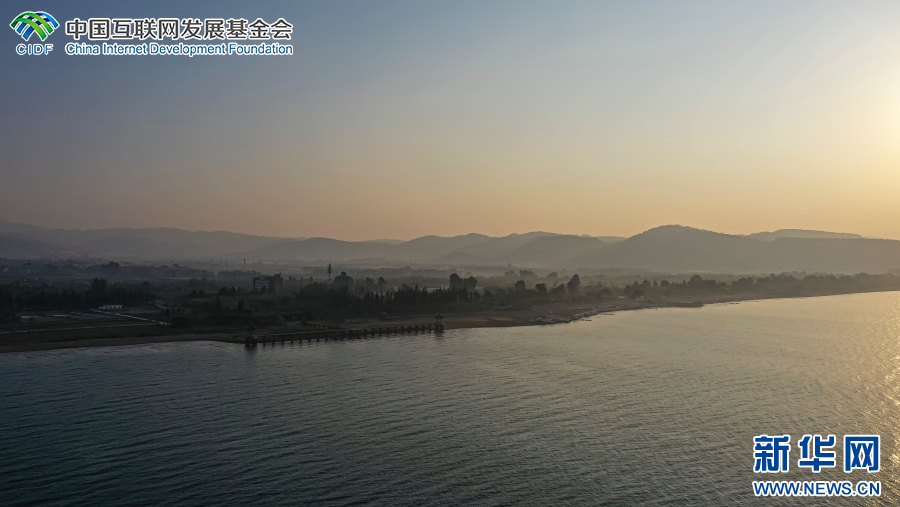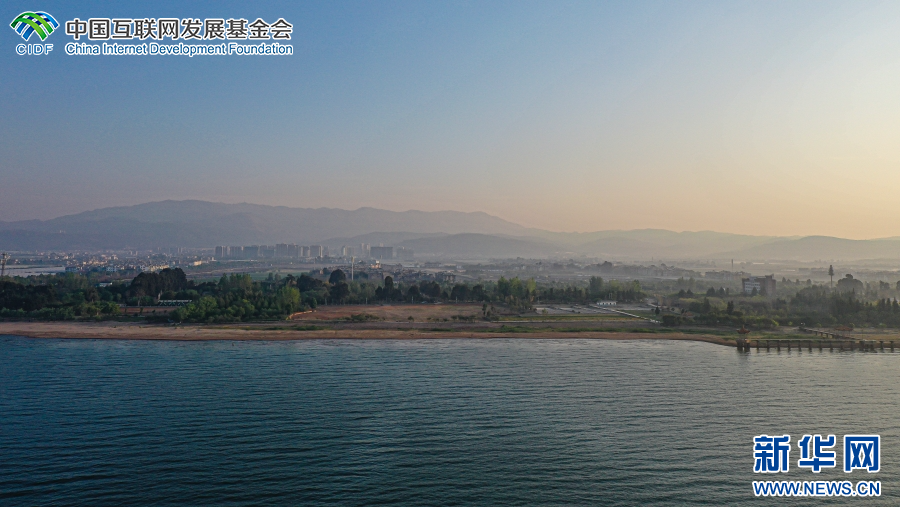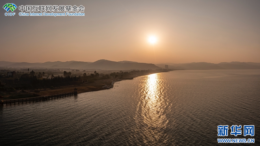航拍撫仙湖日出(4月4日攝)。新華網發(楊洪龍 攝)