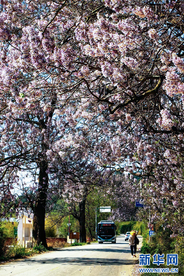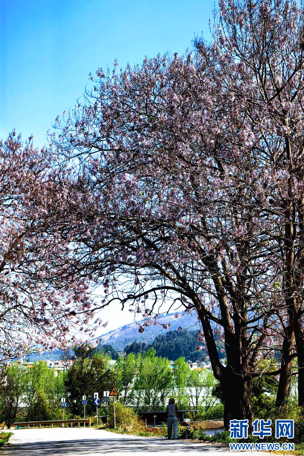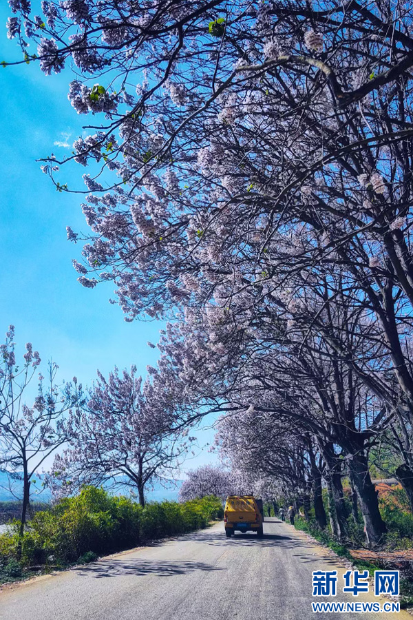 近日,在云南省安寧市,公路兩旁的泡桐花悄然盛放,一簇簇淡紫色的花朵簇擁枝頭,微風拂過,似風鈴一般的花朵隨風舞動。長約兩公里的淡紫色花海,點綴著車來車往的鄉村公路。(完)(安寧市融媒體中心)