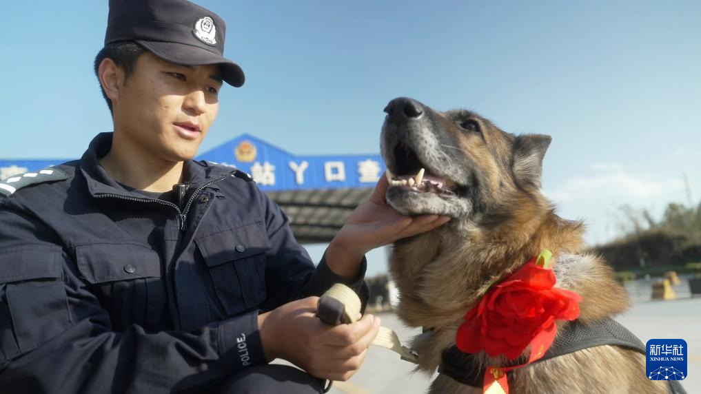近日,云南出入境邊防檢查總站紅河邊境管理支隊蠻耗邊境檢查站警犬“龍虎”迎來了退役的日子,戰友們為它舉行了莊重的退役儀式,“后輩”警犬為它銜來大紅花。