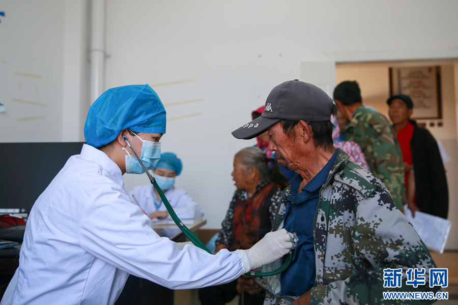 在云南省曲靖市沾益區金龍街道社區衛生服務中心,醫護人員為老年人進行內科聽診(4月10日攝)。新華網發(楊俊鵬 攝)
