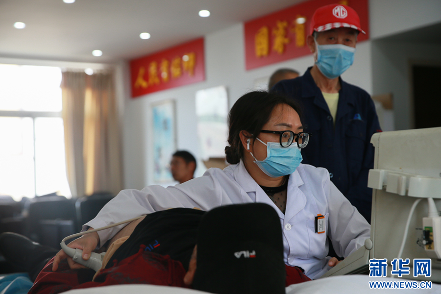 在云南省曲靖市沾益區西平街道社區衛生服務中心,醫護人員為老年人做B超檢查(4月10日攝)。新華網發(楊俊鵬 攝)