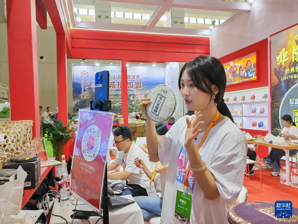 4月19日,參展商工作人員在第十六屆中國云南普洱茶國際博覽交易會上進行電商直播。新華社記者 林碧鋒 攝