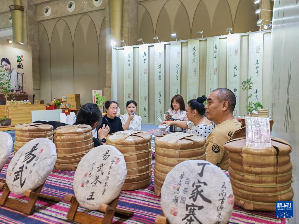 4月19日,參觀者在第十六屆中國云南普洱茶國際博覽交易會上品茶交流。新華社記者 林碧鋒 攝