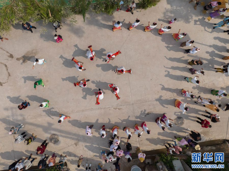 航拍芒發村民小組,村民跳舞(4月14日攝)。新華網 劉東 攝