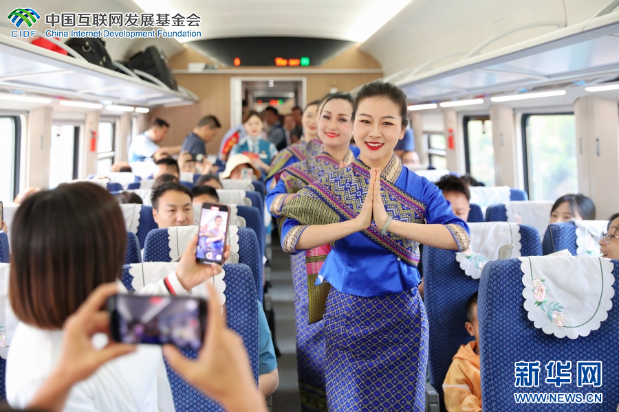 前往西雙版納的列車上,工作人員用歌舞迎接旅客(4月13日攝)。新華網發(楊紫軒 攝)