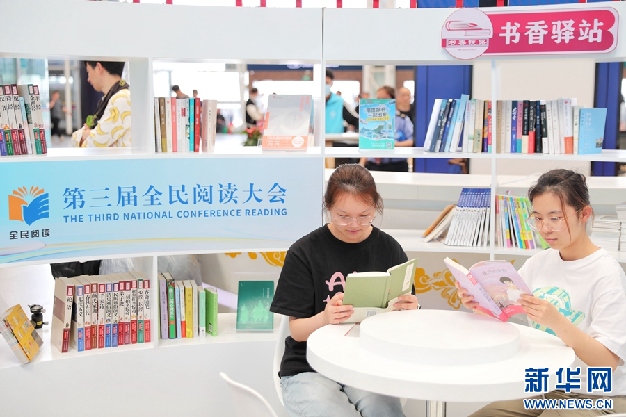 昆明站書香驛站,兩名旅客正在閱讀書籍(攝于4月24日)。新華網發(楊紫軒 攝)