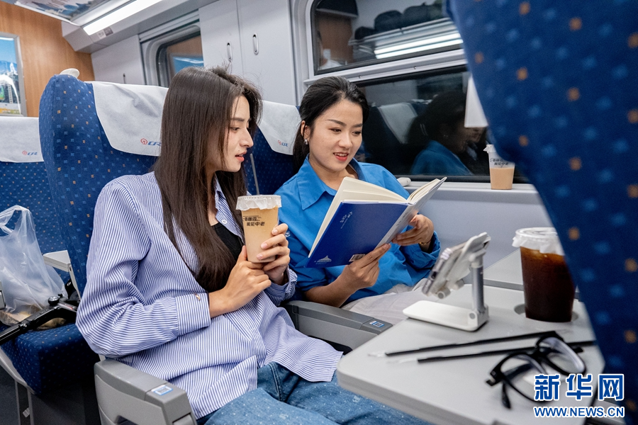 兩名旅客正在閱讀“書香列車”上提供的書籍(攝于4月23日)。新華網發(周濤 攝)