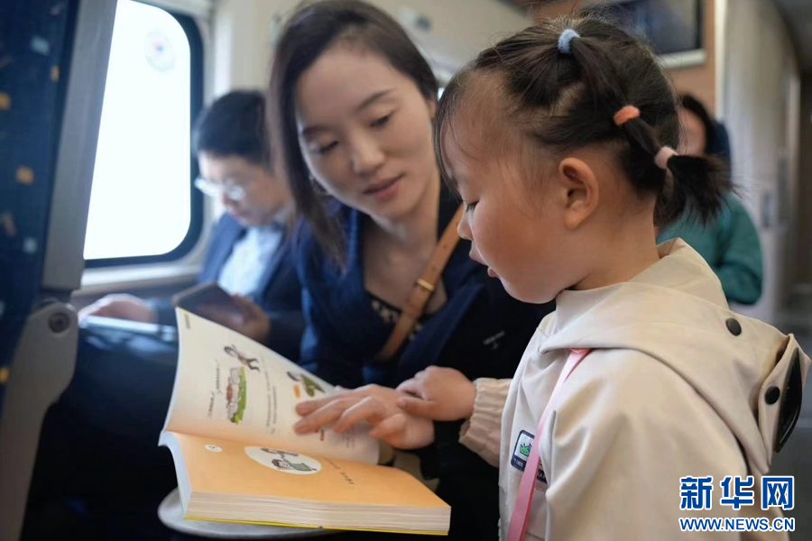 車廂里,一名小朋友在大人的指導下閱讀圖書(攝于4月23日)。新華網發(周濤 攝)