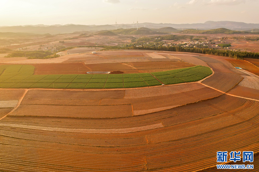 近日,位于滇東高原的云南省曲靖市沾益區的農田里,紅土地上開出成行的壟,阡陌縱橫,如同寫在大地上的道道詩行??罩续B瞰,紅土地與村莊、山巒、風車、夕陽等相應成景,構成了一幅美麗的田園畫卷。新華網發(楊俊鵬 攝)