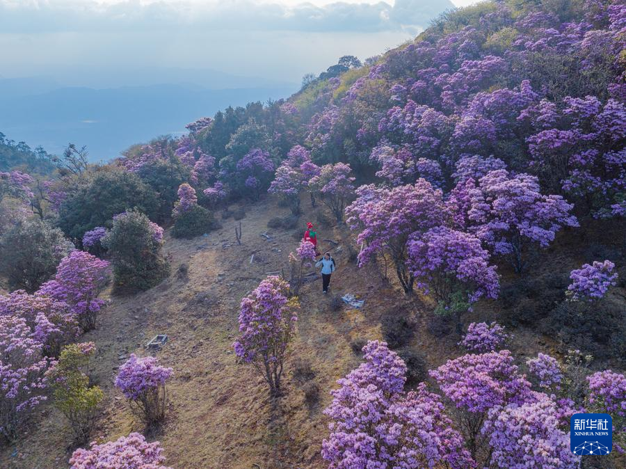 4月24日,游人在云南省大理白族自治州洱源縣馬耳山杜鵑花海游玩(無人機照片)。新華社發(羅新才 攝)