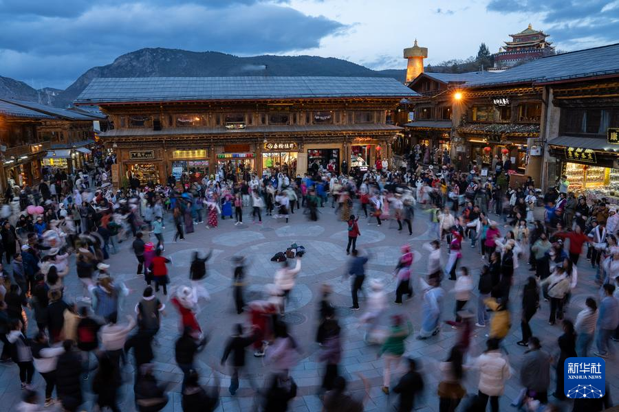 5月3日,在云南迪慶藏族自治州香格里拉市,游客與當地群眾在獨克宗古城四方街廣場跳鍋莊。新華社發(馬宏波 攝)