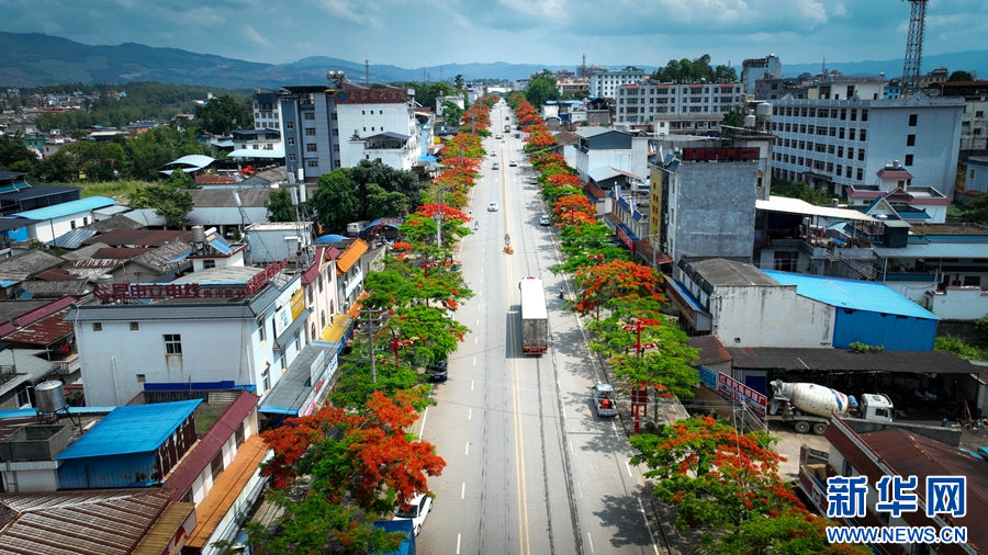 近日,云南省德宏傣族景頗族自治州隴川縣的鳳凰花競相綻放,行走在縣城內,抬眼便可見到如火般綻放的鳳凰花,花朵鮮艷奪目,在陽光的照耀下格外美艷,為隴川縣城披上一襲絢爛的華服。(完)(桂金再 沙相 孔扎選晶 尹興朋)