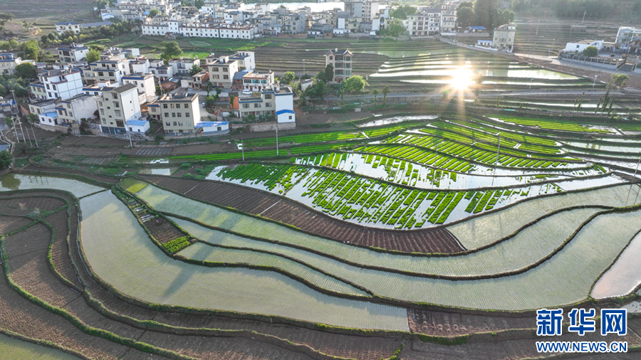 航拍云南省曲靖市沾益區天生壩村田野,秧苗翠綠(5月10日攝)。新華網發(孫文來 攝)