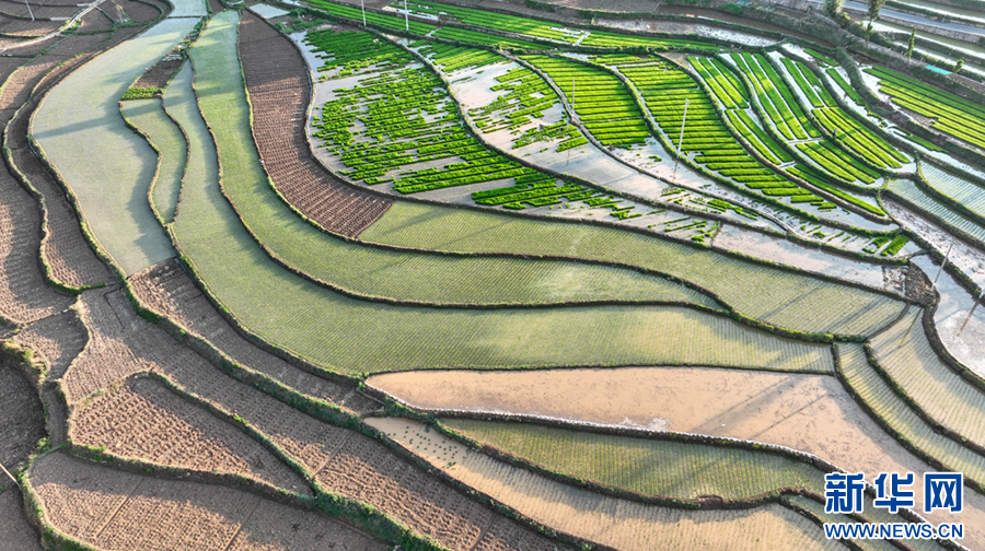 初夏時節,在云南省曲靖市沾益區天生壩村雨后的田野里,農民搶抓農時,忙著栽插秧苗,整理稻田。勞作的身影與阡陌農田、翠綠的秧苗、遠處的村莊,共同構成一幅美麗的鄉村田園畫卷。新華網發(孫文來 攝)
