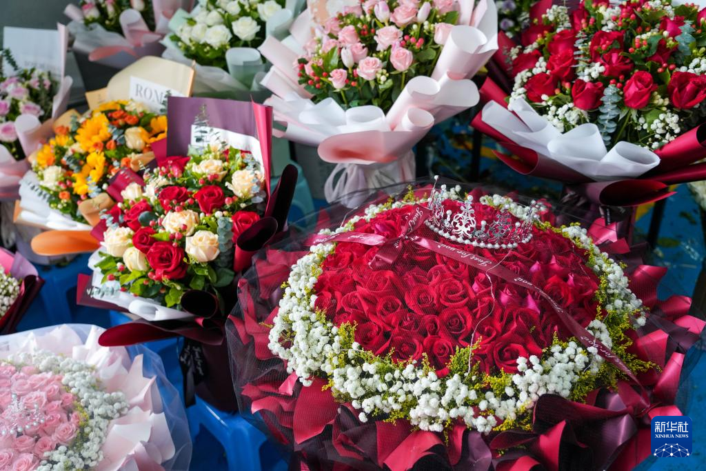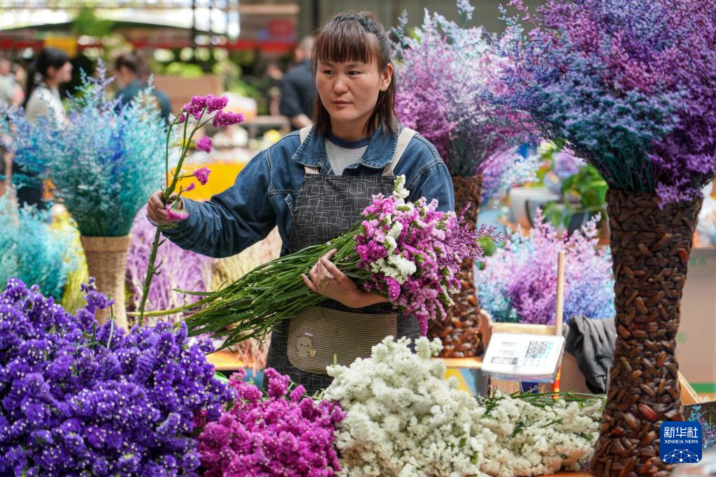 5月15日,商家在昆明斗南花卉交易市場里銷售花束。新華社記者 王靜頤 攝