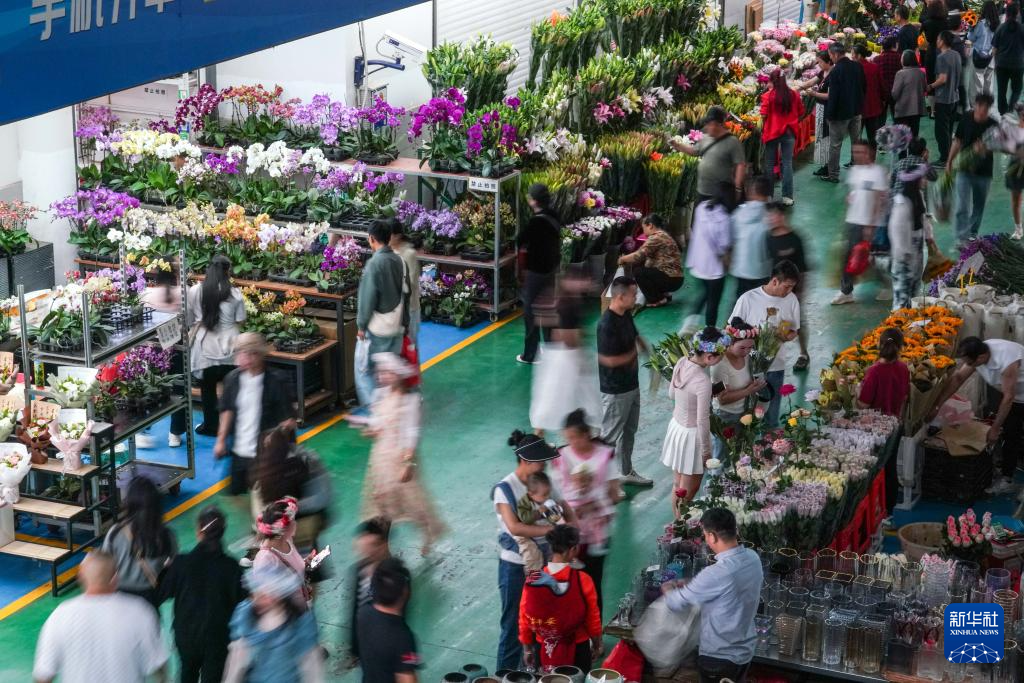 5月15日,市民、游客在昆明斗南花卉交易市場里游覽、購買鮮花。新華社記者 王靜頤 攝