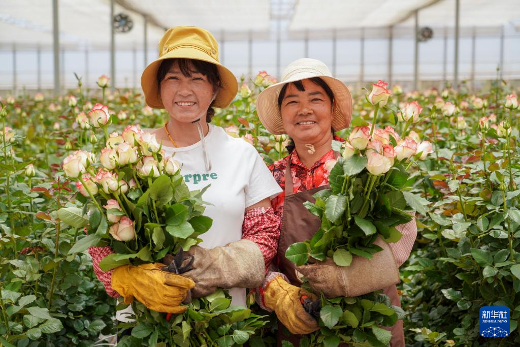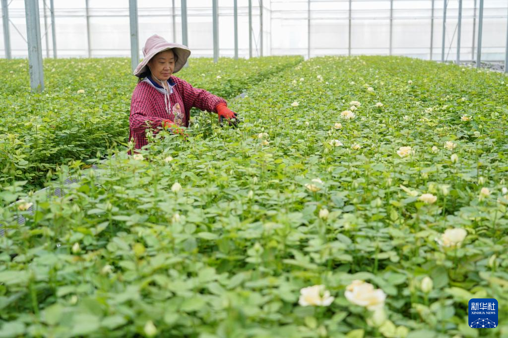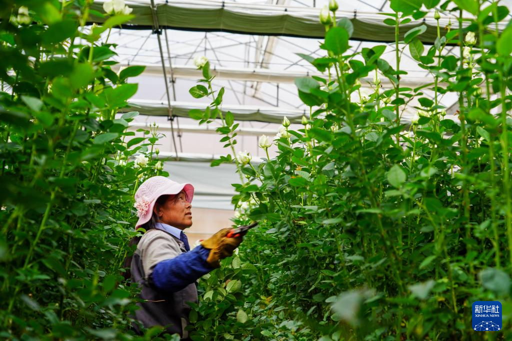 5月15日,花農韓美仙在景都花卉種植基地里采收玫瑰花。新華社記者 王靜頤 攝