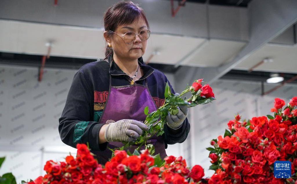 5月15日,工作人員在晉寧區國際花卉綜合物流中心里打包鮮切花。新華社記者 王靜頤 攝