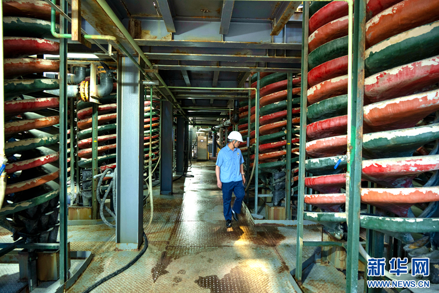 華聯鋅銦金竹山資源再生車間螺旋溜槽選別廠房內,工作人員正在檢查設備運行情況(3月6日攝)。新華網發(劉起 攝)