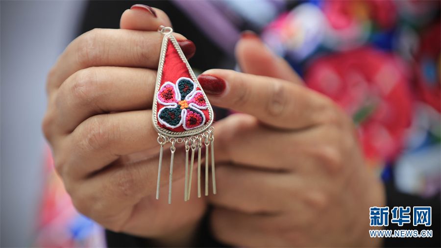 做工精細的彝繡耳飾(2023年6月9日攝)。新華網發(徐華陵 攝)
