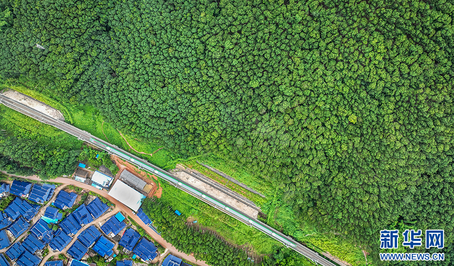 航拍視角下的大龍哈村,中老鐵路穿寨而過(資料圖)。新華網發(楊奇武 供圖)