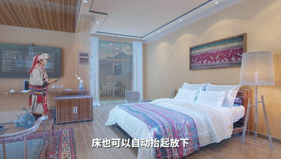 未來,我的客棧房間內不僅有民族元素,還會更智能,比如用手機操縱房間的燈光,床也可以自動抬起放下,窗簾也可以實現自動化,透過窗戶,游客們能看到美麗的風景。