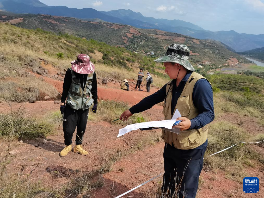 工作人員在現場測量恐龍足跡化石。(祿豐市融媒體中心供圖)