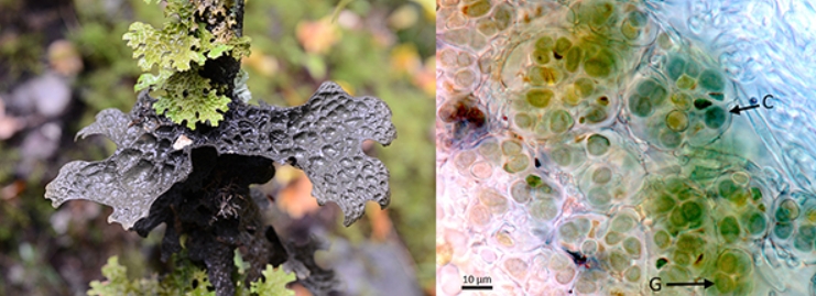 藍藻型肺衣(左圖深棕色)和它的共生藻層圖片(右圖),圖中淺綠色的為綠藻 (G),深藍綠色的為藍藻(C)