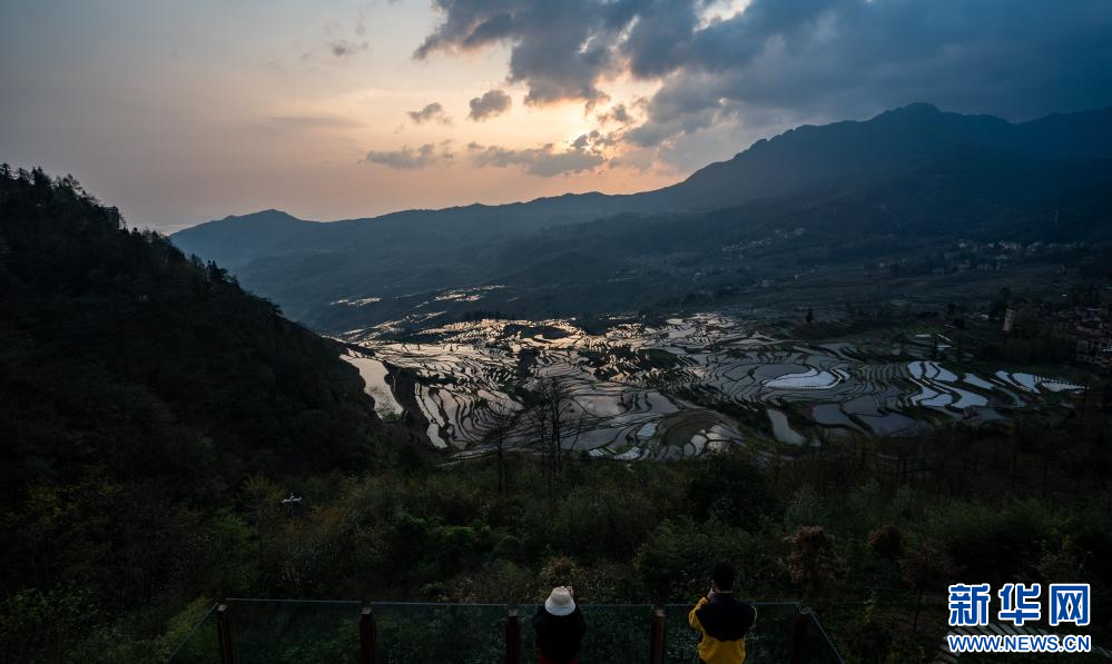 游客在云南省紅河哈尼族彝族自治州元陽縣欣賞哈尼梯田美景。(資料照片)