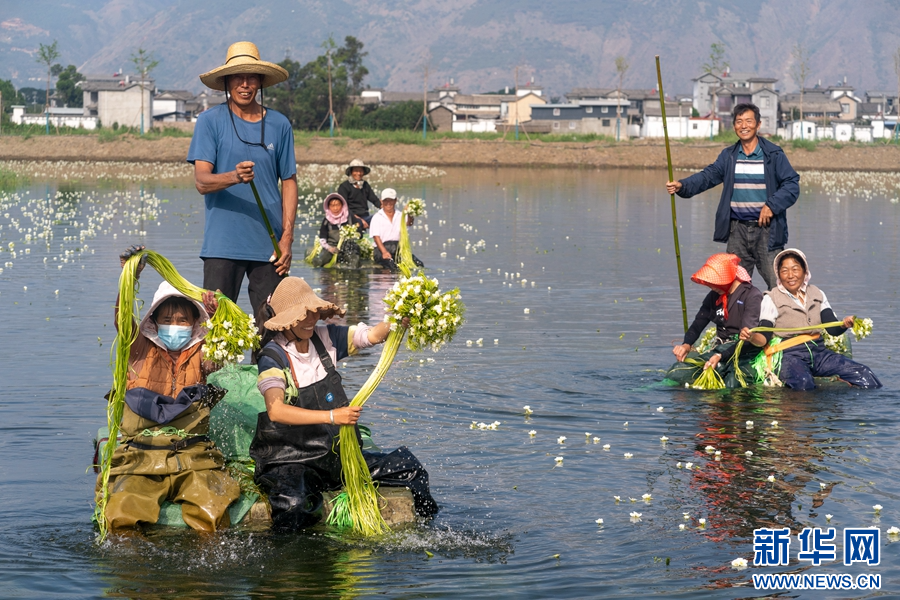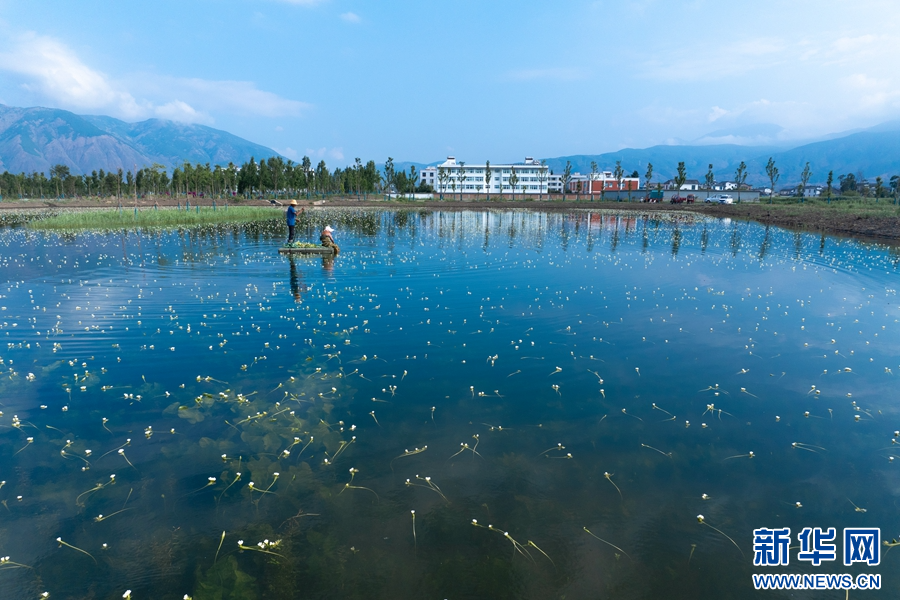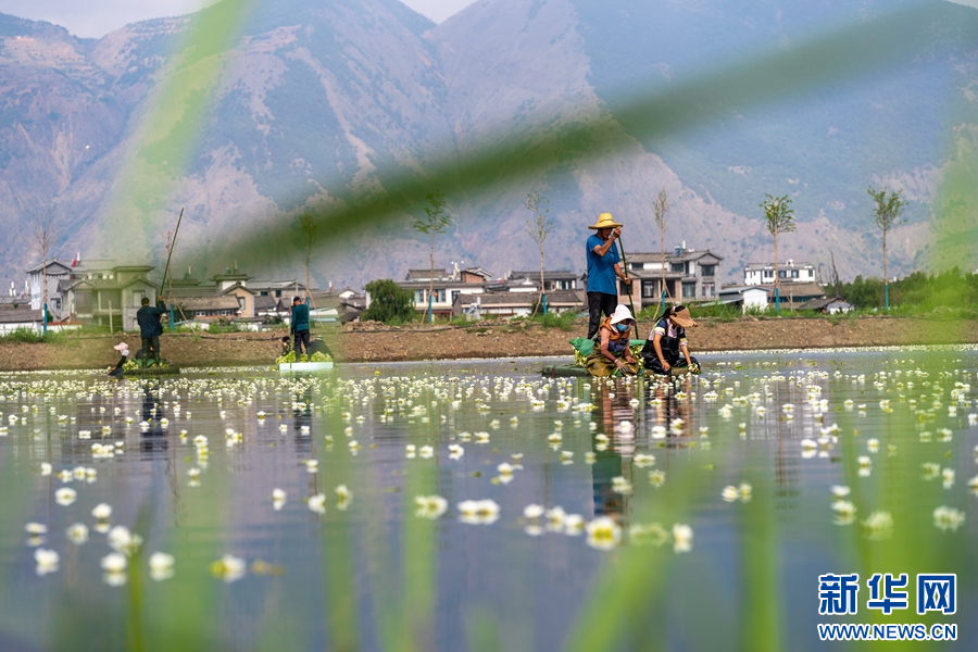 洱源縣右所鎮永安海菜種植基地,農戶在采收海菜(攝于6月5日)。新華網發(羅新才 攝)