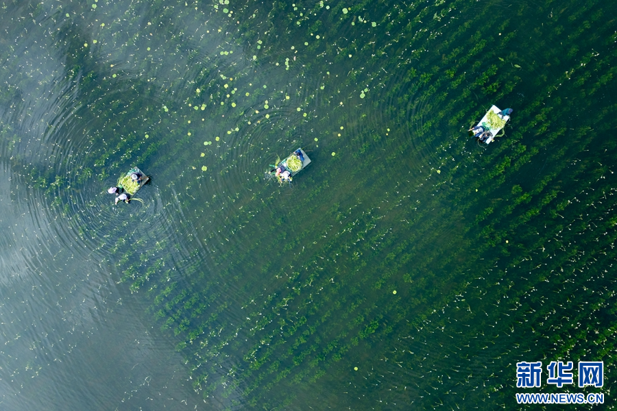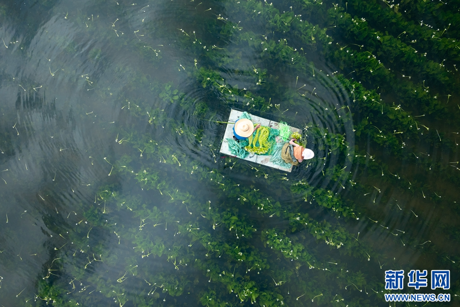 海菜花,一種白花黃蕊的沉水植物,花朵“仙氣飄飄”極具觀賞性,莖葉則可以入菜,在云南大理一帶的餐桌上尤為常見,當地人稱其為“海菜”。近年來,大理州洱源縣將人工種植海菜作為一大綠色生態產業進行扶持和培育,已實現連片種植。近日,洱源縣右所鎮永安海菜種植基地,成片的海菜迎來豐收季。無人機視角下,飄著星星點點白色小花的清澈水面上,農戶劃著自制的小船,搶抓農時采收海菜,滿屏田園詩意,夏日“豐”景如畫。