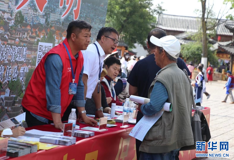 當日上午,在麗江古城玉河廣場,麗江古城保護管理局向游客、商戶及市民等廣大群眾開展遺產監測、綜合執法、房屋修繕、文物保護、生態環境保護、消防安全、文化遺產保護、智慧小鎮建設等內容的咨詢及宣傳展示活動。