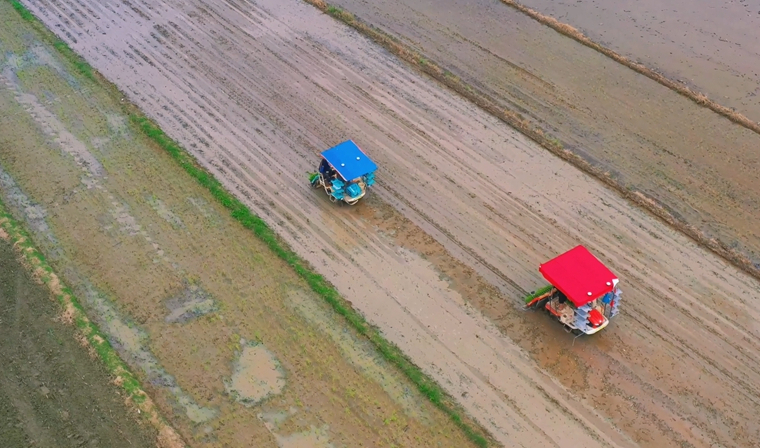 芒種時節,在云南省德宏州隴川縣,一幅忙碌的插秧畫卷正在徐徐展開。移軸鏡頭之下,拖拉機在水田駛過,平整了一塊塊秧田;栽秧機如同正在玩耍的巨型玩具,給秧田鋪上了一層嫩綠的薄紗;彎腰插秧的農民變成了動畫中的“小人國居民”,動作熟練且充滿童趣;給秧苗追肥的植保無人機像小蟲般飛過,在秧田里掀起一陣漣漪。忙碌的機器,勤勞的農民,為金秋豐收打下了基礎。