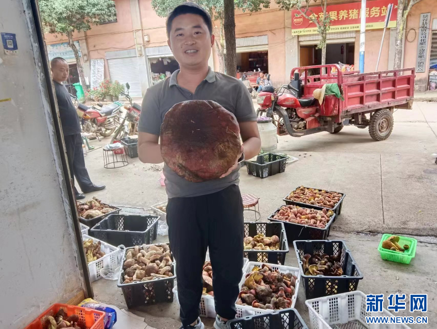 菌農展示采摘的野生菌(6月11日攝)。新華網發(景谷縣融媒體中心供圖)