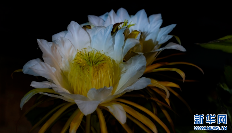 近日,云南省德宏傣族景頗族自治州瑞麗市的攝影愛好者,用延時攝影記錄下火龍果花盛開的瞬間。與火龍果果實熱烈的顏色不同,火龍果花的花瓣潔白剔透,花蕊淡黃,在月光下顯得嫻靜淡雅。